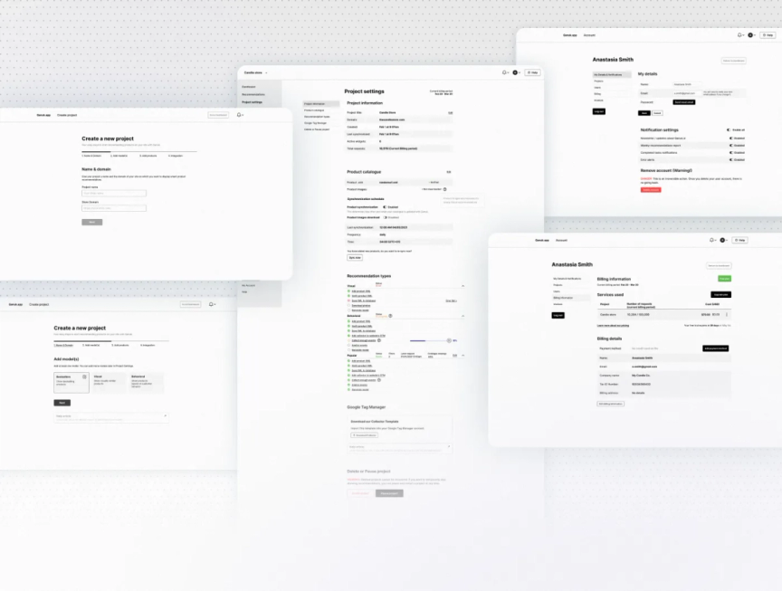 Each user can have any number of projects, so the user account takes precedence. Here the user can manage their projects, grant access to other users, and track costs. The client pays for the number of recommendations received, so we give the user the possibility to set a monthly budget and alerts, e.g., alert when 50% of the budget is used up.
