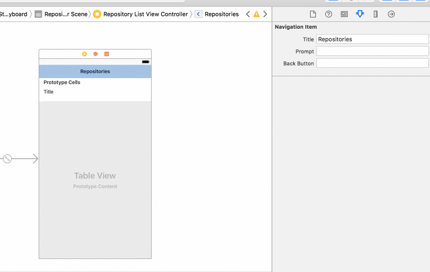 17. Add Navigation View Controller. In Storyboard select on Repository List View Controller. Then in Xcode menu click Editor → Embed In → Navigation Controller